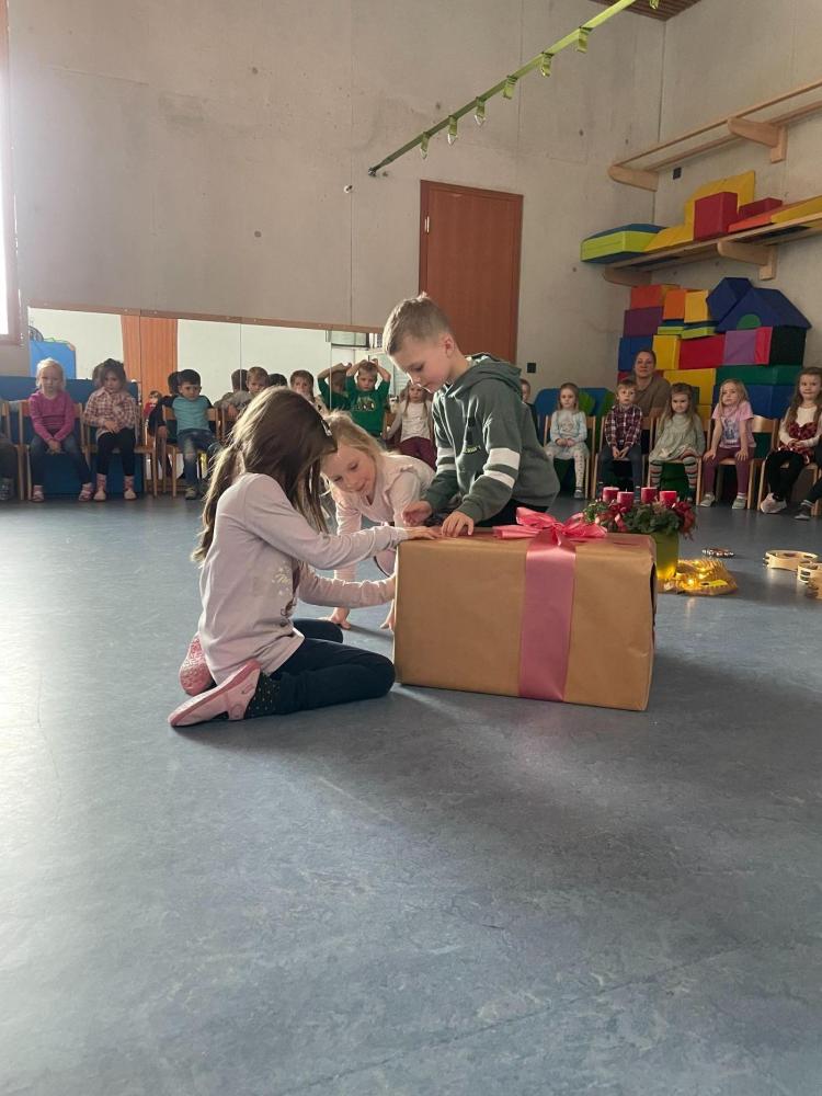 Zum Schluss übergab der Nikolaus den Kindern ein riesengroßes Paket - ein Gemeinschaftsgeschenk für alle! Die Kinder freuten sich sehr über die verschiedenen Puzzles und Legespiele. Jedes Kind bekam dann auch noch einen Schokololli in Form eines Engels mit nach Hause.