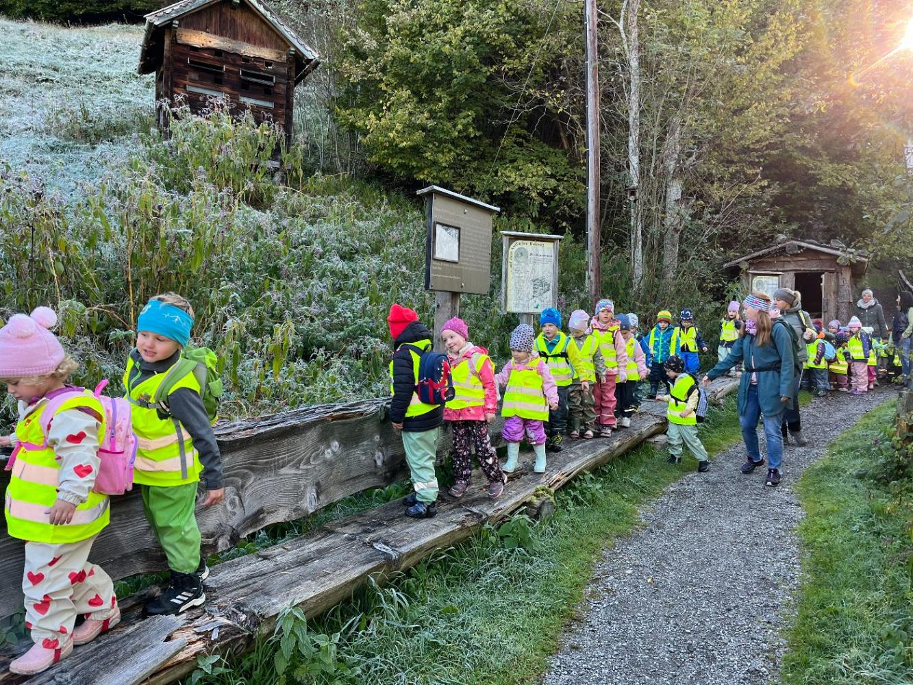 Mit großer Vorfreude stiegen die Kinder in den Bus, der sie nach Auffach brachte. Von dort aus ging es zu Fuß weiter über den "Holzweg". Unterwegs hatten die Kinder viel zu entdecken und genossen die Zeit an der frischen Luft. Gemeinsam wandern machte allen richtig Spaß!